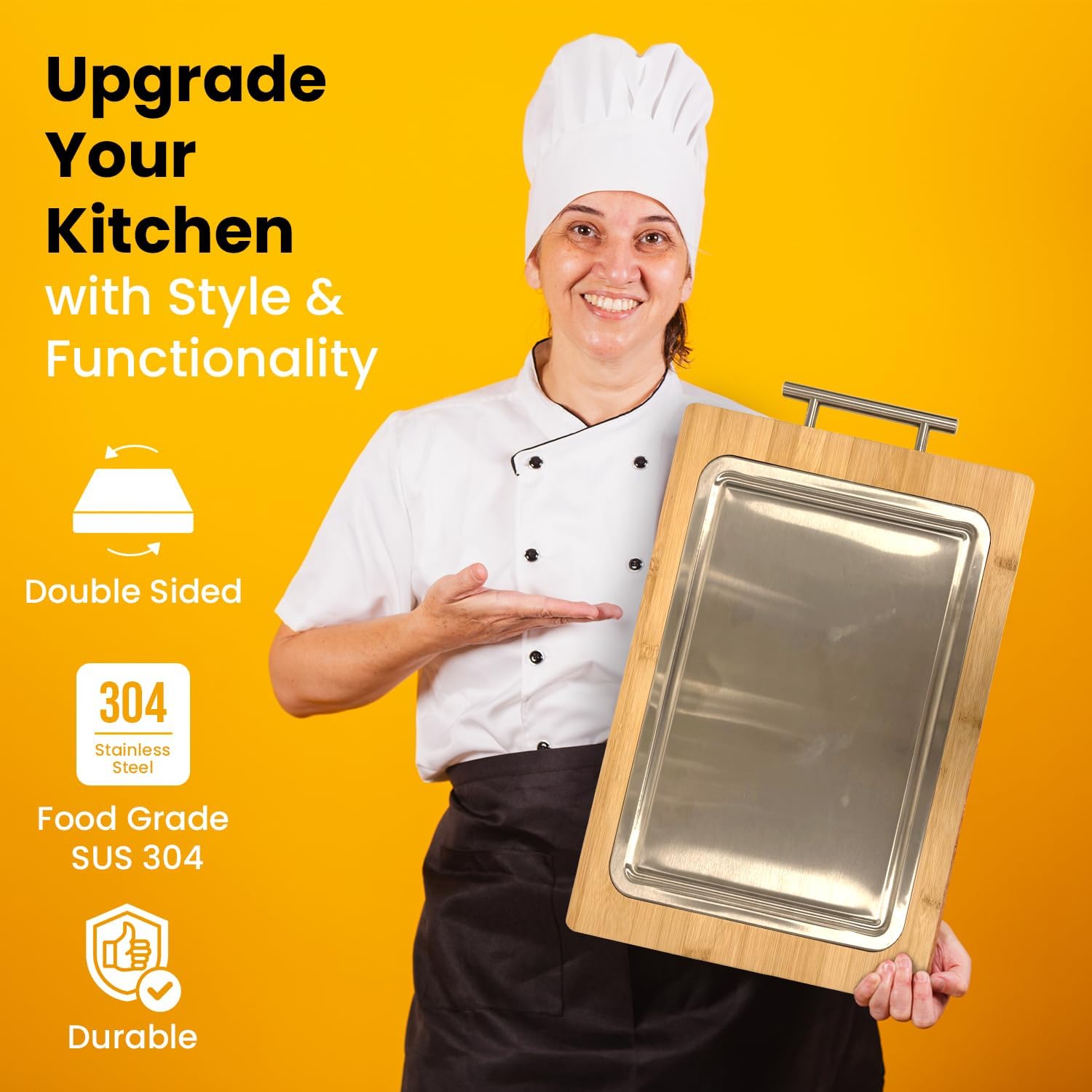 BambooFlux offers a 2-in-1 cutting board with a bamboo side for precise chopping and a large stainless steel cutting board for any task. The metal cutting board side is durable, easy to clean, and perfect for meats. The bamboo side is eco-conscious, knife-friendly, and naturally antimicrobial