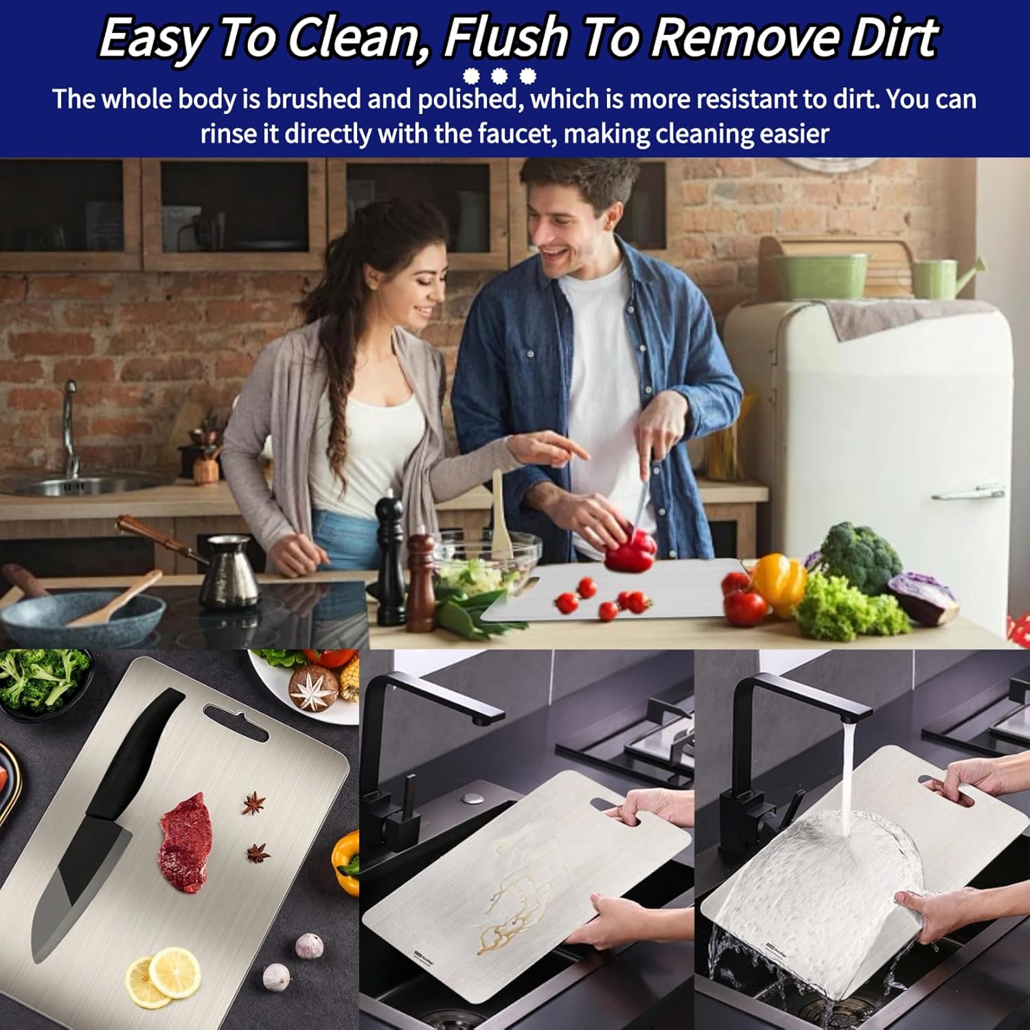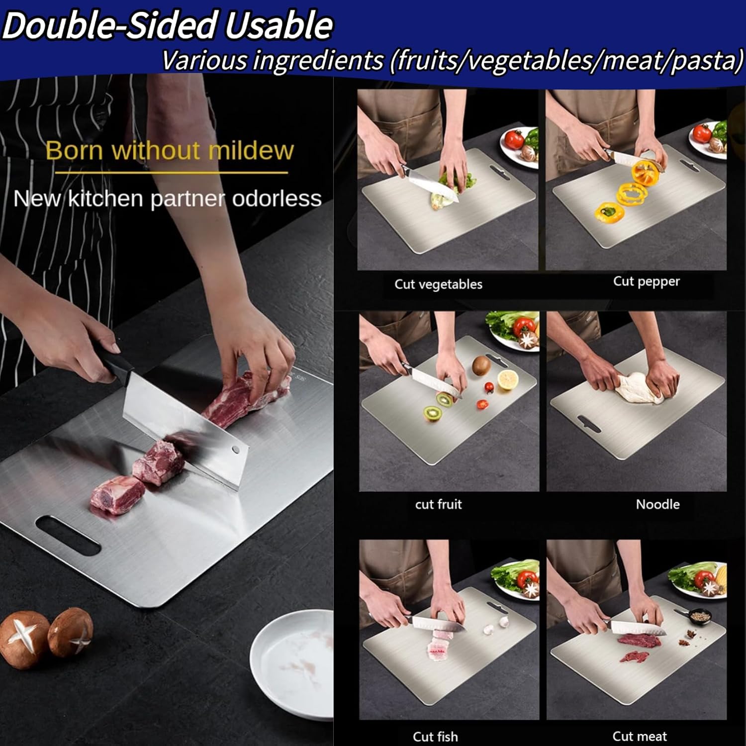 Stainless steel doesn’t absorb liquid and microparticles that host bacteria unlike plastic or wooden chopping boards which are susceptible to those