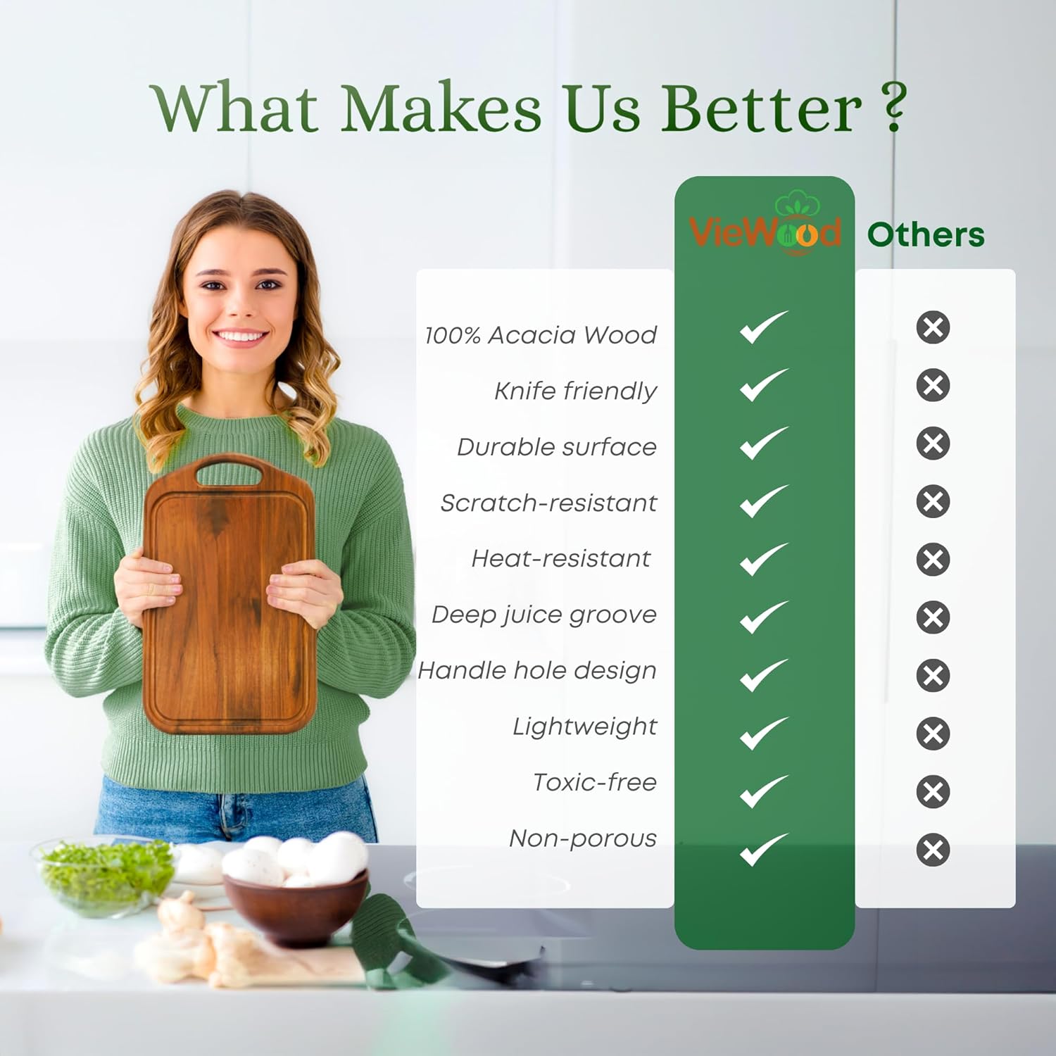 VieWood Acacia Wood Cutting Board with Juice Groove, Hanging Hole & Grip Handle for Meat, Vegetables and Cheese, Knife Friendly, Caperci Better Wood Chopping Board